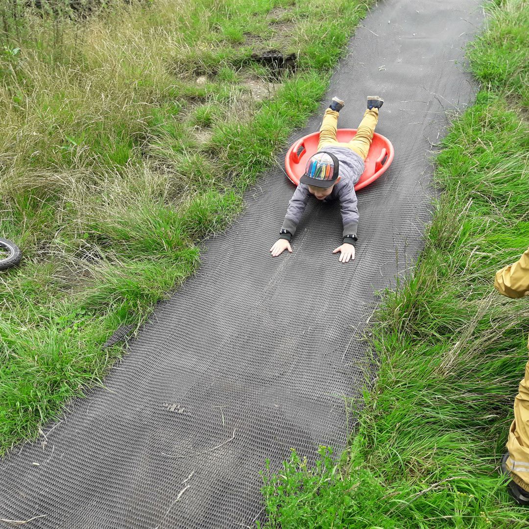 Vores legeplads er stor og er derfor inddelt i zoner, en til hver gruppe. Ved at en gruppe har sit eget afgrænset område, giver det børnene tryghed og overskuelighed. Hermed er der sikret nærværende tilgængelige voksne tæt på, samtidig med at der også er mulighed for at børnene kan lege uforstyrret. Legepladsen er en fusion af en gammel og en ny legeplads, derfor er halvdelen tætbevokset og den anden halvdel ikke. Vi er altid i gang med at tilpasse og skabe nye læringsmiljøer ud fra hvad børnene kalder på.